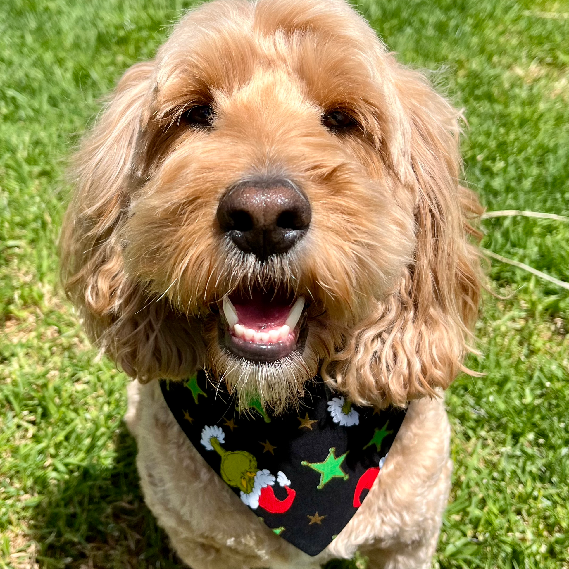 Unleash your pup's mischievous side with The Greenman scrunchie bandana! Featuring everyone's favourite grumpy character, this playful design brings a cheeky dose of holiday humour to your furry friend's wardrobe. Perfect for dogs with attitude and owners who love a good laugh, this bandana captures all the sass and charm of the season's most iconic grouch. Your pup will steal hearts—and maybe a few smiles!